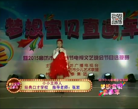 夢(mèng)想寶貝直通車暨2015年廊坊市少兒春晚優(yōu)秀節(jié)目選拔活動(dòng)由廊坊廣播電視臺(tái)主辦,廊坊市少兒藝術(shù)聯(lián)盟承辦。