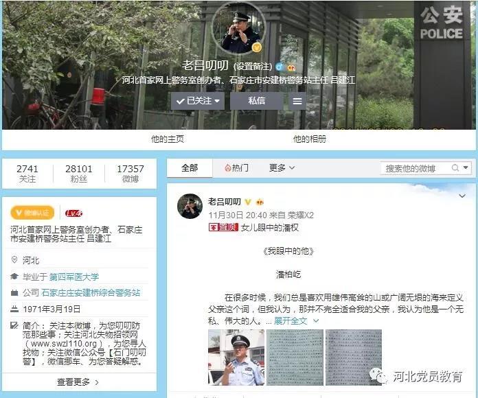 “老呂叨叨”的新浪微博,永遠(yuǎn)地定格在了昨晚(11月30日)22:02。而置頂?shù)囊粭l,則是《女兒眼中的潘權(quán)》。潘權(quán),秦皇島撫寧鎮(zhèn)派出所所長(zhǎng),2017年11月9日上午,因突發(fā)大面積心梗,搶救無(wú)效離世,年僅49歲。網(wǎng)友說(shuō):“昨天,你還在微博上緬懷戰(zhàn)友,今天,你就成了我們緬懷的對(duì)象!老呂,一路走好。”