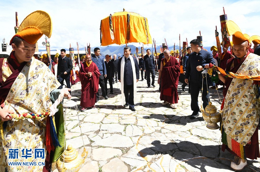 當天下午,習近平來到位于拉薩西郊的哲蚌寺。措欽大殿廣場,法號齊鳴,哲蚌寺管委會負責人向總書記敬獻哈達,僧人提香爐、持寶傘,總書記沿臺階步入大殿。習近平聽取西藏宗教工作情況和哲蚌寺加強創(chuàng)新寺廟管理情況介紹,并察看措欽大殿,充分肯定哲蚌寺這些年在擁護中國共產(chǎn)黨領(lǐng)導、擁護社會主義制度、維護祖國統(tǒng)一等方面作出的積極貢獻。習近平走出大殿,數(shù)十名僧人手捧哈達歡送總書記。習近平強調(diào),要全面貫徹黨的宗教工作基本方針,尊重群眾的宗教信仰,堅持獨立自主自辦原則,依法管理宗教事務,積極引導藏傳佛教與社會主義社會相適應,促進宗教和順、社會和諧、民族和睦,在推動社會發(fā)展進步中發(fā)揮積極作用。