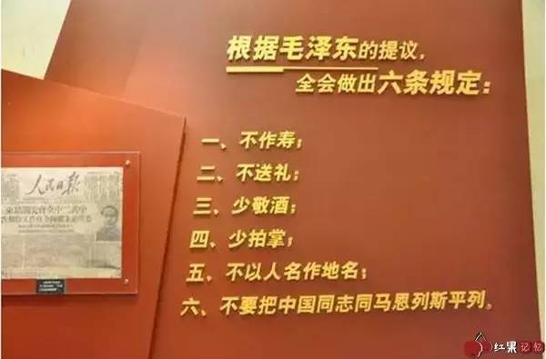 在西柏坡紀(jì)念館內(nèi),有這樣一塊展板,上面寫著“根據(jù)毛澤東的提議,全會(huì)作出六條規(guī)定:一、不做壽;二、不送禮;三、少敬酒;四、少拍掌;五、不以人名作地名;六、不要把中國(guó)同志同馬恩列斯平列。”這是當(dāng)年對(duì)中國(guó)共產(chǎn)黨人定下的規(guī)矩。