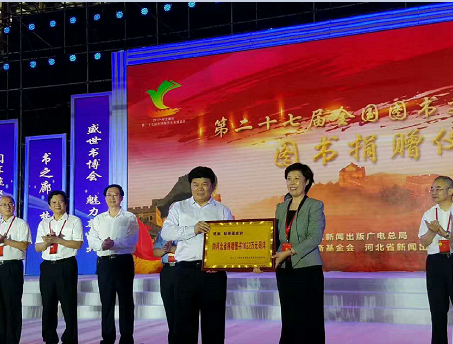 2017年5月31日上午,第二十七屆全國(guó)圖書交易博覽會(huì)圖書捐贈(zèng)儀式在廊坊國(guó)際會(huì)展中心舉行。國(guó)家新聞出版廣電總局副局長(zhǎng)吳尚之,河北省委常委、宣傳部部長(zhǎng)田向利,韜奮基金會(huì)理事長(zhǎng)聶震寧以及廊坊市人民政府市長(zhǎng)陳平,廊坊市委常委、宣傳部長(zhǎng)、統(tǒng)戰(zhàn)部長(zhǎng)王曦等領(lǐng)導(dǎo)出席此次圖書捐贈(zèng)儀式。