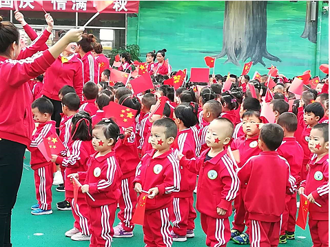 升旗儀式現(xiàn)場(chǎng),隨著激昂有力的出旗樂(lè)曲,由駐廊某部隊(duì)官兵和大班小朋友組成的國(guó)旗護(hù)衛(wèi)隊(duì)邁著鏗鏘的步伐,將國(guó)旗護(hù)送到升旗臺(tái)前。國(guó)歌聲響起,身著統(tǒng)一園服的小朋友們望著冉冉升起的五星紅旗唱響國(guó)歌,共同祝愿祖國(guó)68歲生日。