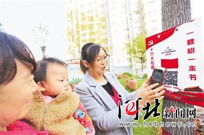走進(jìn)位于廊坊市區(qū)銀河南路的億合社區(qū),只見(jiàn)中心文化廣場(chǎng)及小區(qū)主路兩邊的樹(shù)上,350余塊標(biāo)有“十九大專題”字樣的掃碼閱讀書牌格外顯眼。書牌以耀眼的紅色為主,左邊寫著“十九大專題”,右邊寫著“一棵樹(shù)一本書”,中間是一個(gè)大大的二維碼。居民只需拿出手機(jī)對(duì)著書牌上的二維碼一掃,即可獲得一本電子書籍,存儲(chǔ)方便,隨時(shí)閱讀。