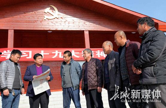 香河縣慶功臺村黨總支書記范國生(左二)為村民解讀十九大精神。王曉桐 攝