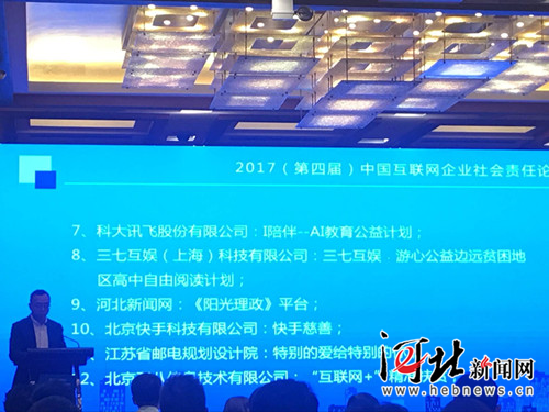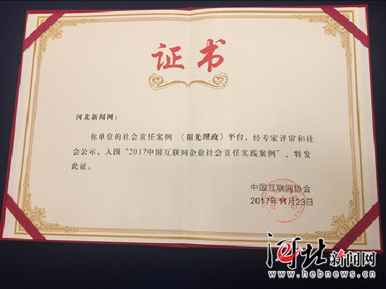 11月23日下午,2017(第四屆)中國互聯(lián)網(wǎng)企業(yè)社會責(zé)任論壇在北京國際飯店會議中心舉行,會上發(fā)布了2017中國互聯(lián)網(wǎng)企業(yè)社會責(zé)任實踐案例名單,河北新聞網(wǎng)《陽光理政》平臺作為河北省唯一一家案例入圍。