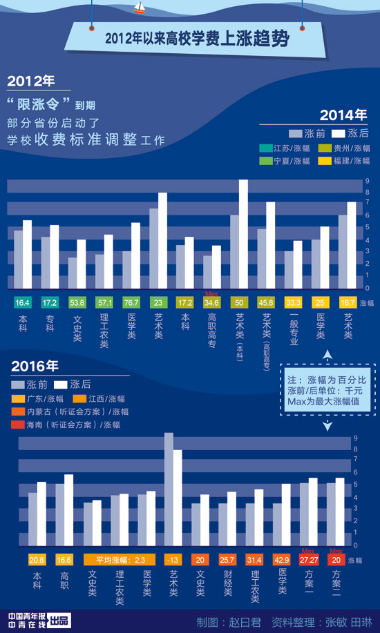 中國青年報社會調(diào)查中心通過民意中國網(wǎng)和問卷網(wǎng)對2000人進行的一項在線調(diào)查結果顯示,14.5%的受訪者認為當前大學的學費十分高,61.5%的受訪者認為比較高,48.1%的受訪者能接受學費上漲20%以下,33.5%的受訪者不能接受任何漲幅。有效保證學費上漲不影響到貧困生,72.6%的受訪者認為學校應提供兼職,同時免除一部分學雜費。