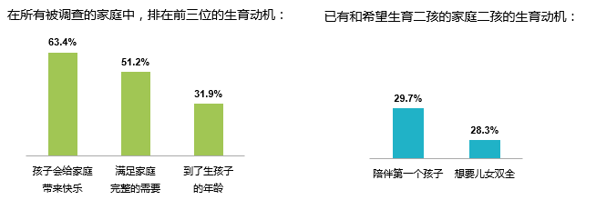 在參與調查的所有父母中,生育動機排在前三位的為“孩子會給家庭帶來快樂”占63.4%,“滿足家庭完整的需要”占51.2%,“到了生育孩子的年齡”占31.9%。