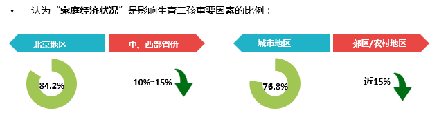 對于發(fā)達省份和城市地區(qū)而言,家庭經濟狀況、家中是否有人照顧孩子等因素對生育二孩的影響作用更大。北京地區(qū)82.4%的父母認為,“家庭經濟狀況”是影響生育二孩的重要因素,比中部、西部省份高出近15個百分點。