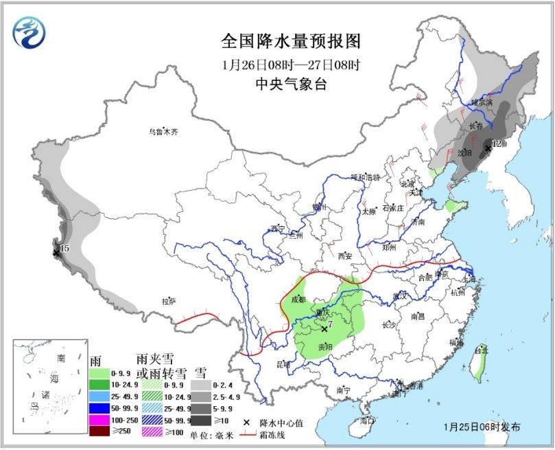 受冷空氣影響,26日至27日,內(nèi)蒙古大部、華北、東北地區(qū)、黃淮、江淮北部等地的最低氣溫或日平均氣溫將下降4~8℃,局地降溫幅度可達10℃以上。上述地區(qū)并伴有4~6級偏北風(fēng)。預(yù)計,25日夜間至26日,東北地區(qū)大部、內(nèi)蒙古中部地區(qū)等地有小到中雪或雨夾雪,其中吉林中東部、遼寧中東部有大雪,局地暴雪;此外,未來三天,新疆西南部、西藏西南部等地有小到中雪,局地大到暴雪。