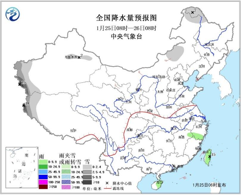 25日08時至26日08時,新疆西南部、西藏西南部、黑龍江北部等地部分地區(qū)有小到中雪,局地有大到暴雪;海南島東部、臺灣等地有小到中雨或陣雨(見圖1)。內(nèi)蒙古中西部、甘肅西部等地有4~6級風(fēng)。