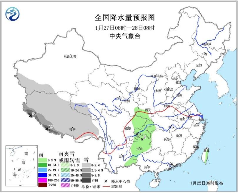 27日08時至28日08時,新疆西南部、西藏大部等地有小中雪,其中,西藏西南部局地有大到暴雪;陜西南部、四川東北部、重慶、貴州及云南東南部等地有小雨或陣雨(見圖3)。