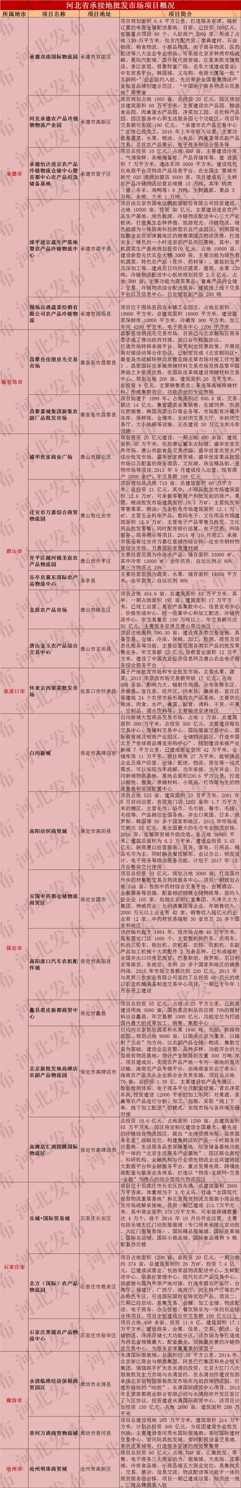 以承德、保定、廊坊、唐山、張家口等市為重點(diǎn)承接北京農(nóng)產(chǎn)品批發(fā)市場過境物流及初加工、大宗倉儲(chǔ)等功能轉(zhuǎn)移。