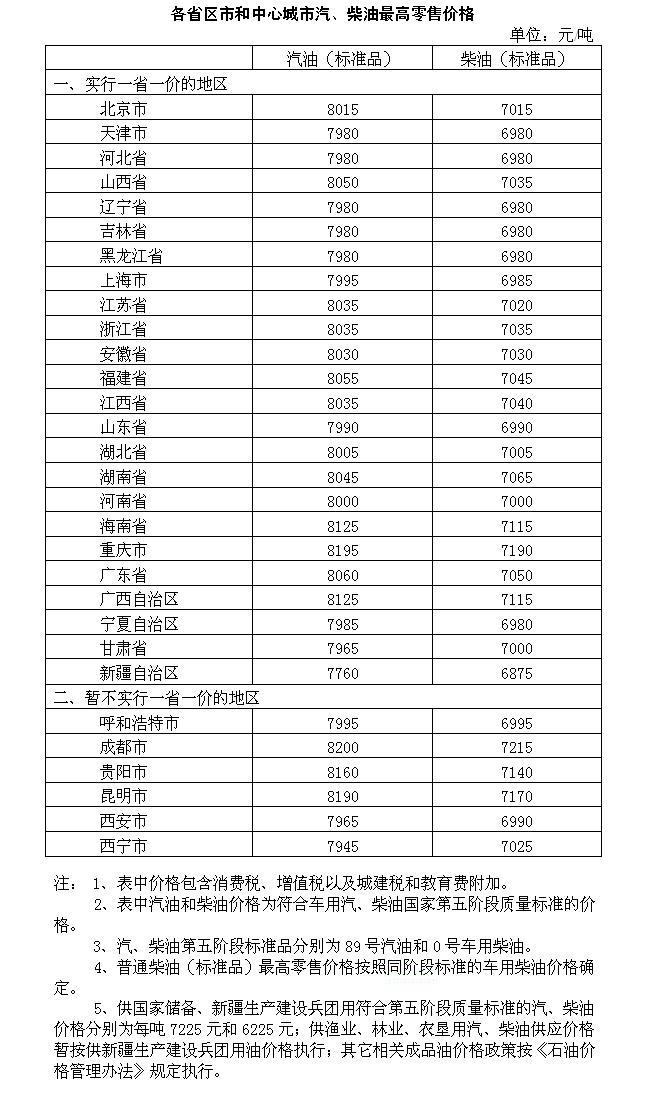 附:各省區(qū)市和中心城市汽、柴油最高零售價格