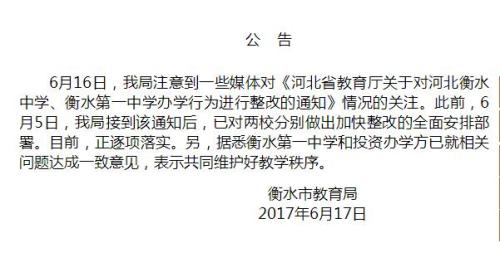 衡水市教育局公告表示,已對兩校分別做出加快整改的全面安排部署。目前,正逐項落實。另外,據(jù)悉衡水第一中學和投資辦學方已就相關(guān)問題達成一致意見,表示共同維護好教學秩序。