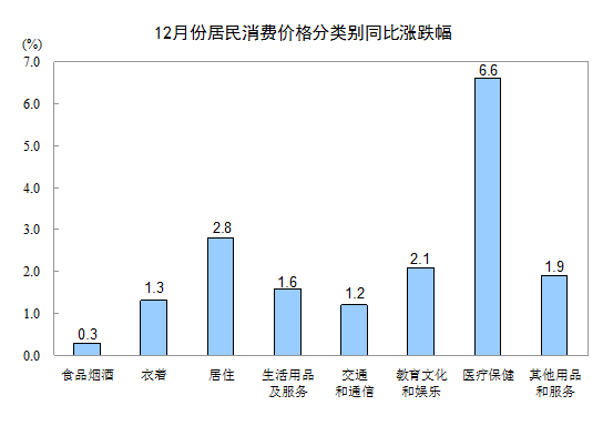 12月份,其他七大類價格同比均上漲。其中,醫(yī)療保健、居住、教育文化和娛樂價格分別上漲6.6%、2.8%和2.1%,其他用品和服務(wù)、生活用品及服務(wù)價格分別上漲1.9%和1.6%,衣著、交通和通信價格分別上漲1.3%和1.2%。