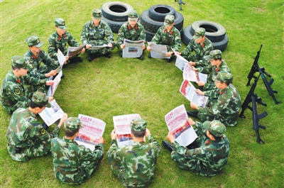 武警廣西總隊(duì)來(lái)賓市支隊(duì)忻城縣中隊(duì)官兵認(rèn)真組織學(xué)習(xí)黨的十九大精神。
