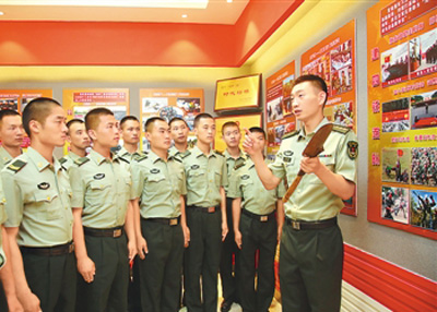陸軍某部“大功三連”指導(dǎo)員(右一)在連隊(duì)榮譽(yù)室為戰(zhàn)士們講傳統(tǒng)故事。