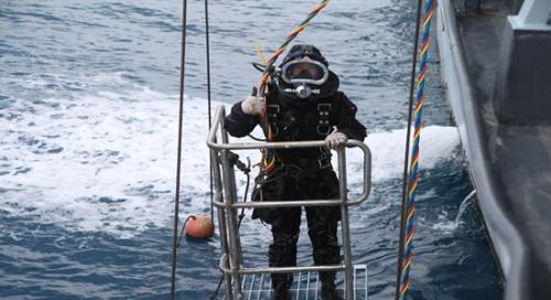 發(fā)現(xiàn)目標位置海域,并不意味著就知曉了潛坐海底潛艇綜合情況,因為對其實施救援還需要更多的信息:潛艇在水下是什么狀態(tài)?它以什么樣的方式潛坐?這些因素才是救援的關(guān)鍵。隨即,潛水員胡助成和張偉聽令下潛,對潛艇進行精確定位。