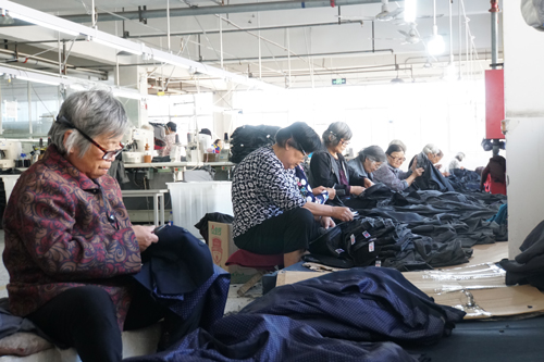 河南沈丘縣永盛服飾有限公司車間內(nèi),在家閑不住的老人們到車間打零工,掙點(diǎn)零花錢