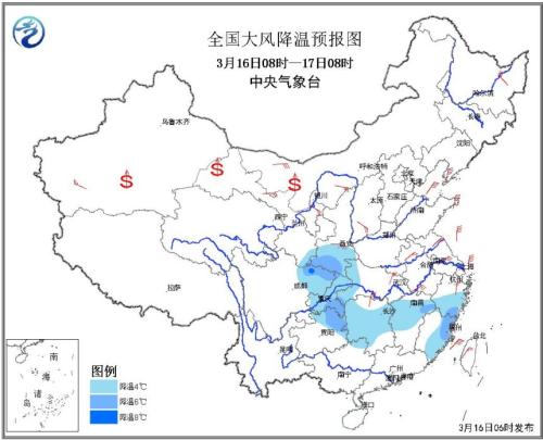 中央氣象臺(tái)3月16日06時(shí)繼續(xù)發(fā)布寒潮藍(lán)色預(yù)警:受冷空氣影響,預(yù)計(jì)16日,陜西南部、湖北西部、西南地區(qū)東部、江南中部和東南部等地氣溫將下降4~6℃,部分地區(qū)降溫幅度可達(dá)8℃。日最低氣溫0℃線將位于黃淮東部、華北南部等地。