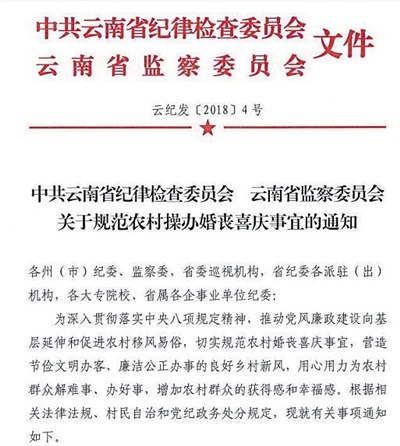 近日,云南省紀委、監(jiān)察委下發(fā)了《關(guān)于規(guī)范農(nóng)村操辦婚喪喜慶事宜的通知》(下稱《通知》),明確云南省農(nóng)村地區(qū)除為本人及子女操辦婚事,為直系親屬操辦喪事外,一律不操辦客事。
