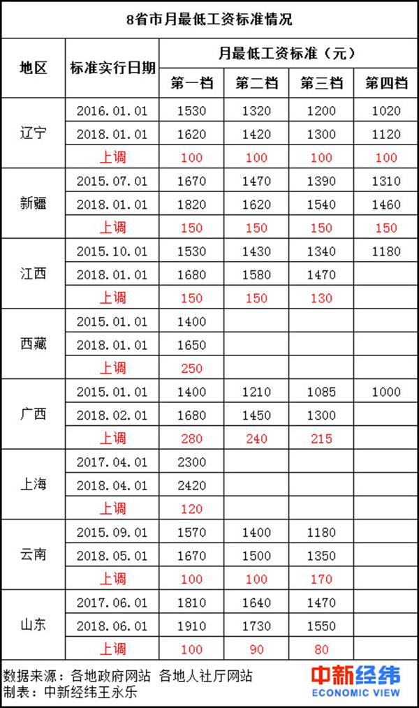 公開資料顯示,除上述8省市外,如相關(guān)政策無調(diào)整,廣東、四川、安徽最低工資標準也將在2018年上調(diào)。