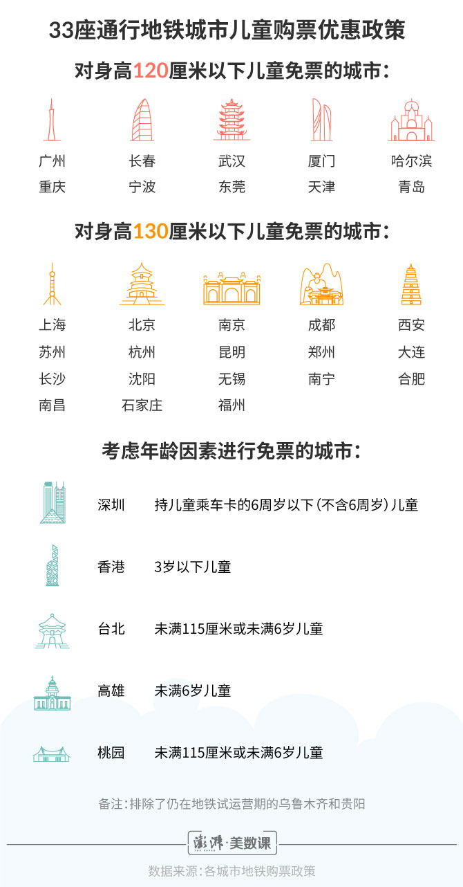 而在全國(含港澳臺)已正式運營地鐵的33座城市中(不含仍在試運營期的烏魯木齊和貴陽),10座城市在地鐵購票政策中規(guī)定,身高120厘米以下的兒童可在成人乘客或購票乘客的帶領(lǐng)下,免費乘車。