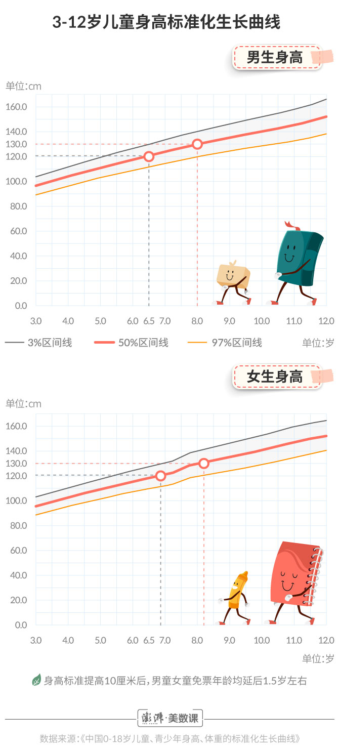 參考兒童身高的增長趨勢將標準線提高至130厘米,相較120厘米而言,是一個更為合理的選擇。參照首都兒科研究所生長發(fā)育研究室和北京大學兒童青少年衛(wèi)生研究所共同發(fā)布的《中國0-18歲兒童、青少年身高、體重的標準化生長曲線》,截取其中3-12歲兒童的身高數(shù)據(jù),可以發(fā)現(xiàn):身高線被拉高10厘米后,享受免票優(yōu)惠的兒童年齡范圍大約被拓寬了1.5歲 。