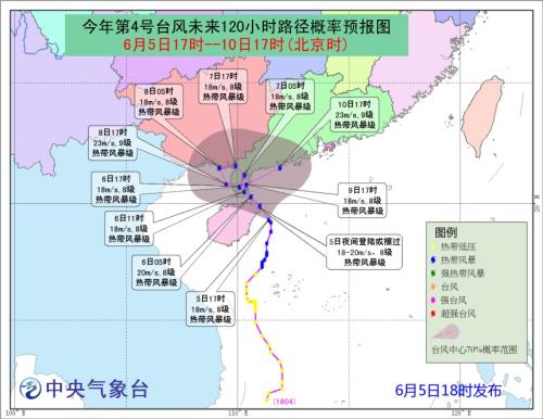 根據(jù)5日18時發(fā)布的預(yù)報,臺風(fēng)將于5日夜間至6日上午擦過或登陸海南東北部沿海,6日下午至7日早晨登陸廣東西部沿海。