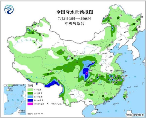 昨天,大到暴雨集中出現在四川盆地至陜西南部一帶。監(jiān)測顯示,陜西西南部出現暴雨,四川盆地中西部和北部出現暴雨或大暴雨,四川廣元、綿陽、資陽、眉山、內江等局地200~240毫米,四川內江點雨量314毫米、綿陽梓潼縣297毫米,上述地區(qū)最大小時降水量50~94毫米;貴州北部、湖南北部、安徽中部、江蘇中南部、浙江、福建、廣東東部等地出現分散性暴雨,局地大暴雨(100~228毫米);北京西部、河北西北部出現大到暴雨,北京門頭溝(135毫米)、河北涿鹿局地大暴雨(100~225毫米)。