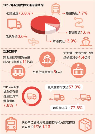 優(yōu)化調(diào)整交通運(yùn)輸結(jié)構(gòu)方面,在7月2日舉行的國(guó)務(wù)院政策例行吹風(fēng)會(huì)上,交通運(yùn)輸部有關(guān)負(fù)責(zé)人介紹,以推進(jìn)大宗貨物運(yùn)輸“公轉(zhuǎn)鐵、公轉(zhuǎn)水”為主攻方向,通過(guò)三年集中攻堅(jiān),到2020年實(shí)現(xiàn)全國(guó)鐵路貨運(yùn)量較2017年增加11億噸、增長(zhǎng)30%,水路貨運(yùn)量增加5億噸、增長(zhǎng)7.5%,沿海港口大宗貨物公路運(yùn)輸量減少4.4億噸。今年起,在全國(guó)范圍實(shí)施鐵路運(yùn)能提升、水運(yùn)系統(tǒng)升級(jí)、公路貨運(yùn)治理、多式聯(lián)運(yùn)提速、信息資源整合、城市綠色配送等六大行動(dòng)。