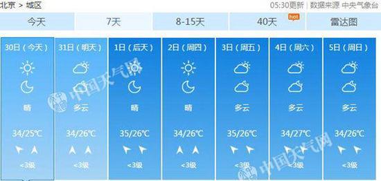 北京市氣象臺(tái)預(yù)計(jì),今天白天北京晴間多云,早晨有輕霧或霧,東轉(zhuǎn)南風(fēng)二三級(jí),最高氣溫34℃,最小相對(duì)濕度55%;夜間晴間多云,南轉(zhuǎn)東風(fēng)一二級(jí),最低氣溫25℃,最大相對(duì)濕度95%。