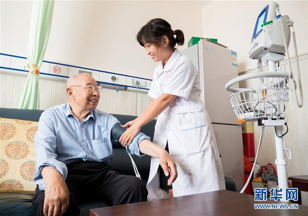 近年來(lái),河北省武邑縣積極引導(dǎo)醫(yī)療機(jī)構(gòu)開展“醫(yī)養(yǎng)結(jié)合”新型養(yǎng)老服務(wù),讓老人樂享幸福晚年。圖為縣醫(yī)院醫(yī)養(yǎng)中心工作人員在養(yǎng)老公寓為老人測(cè)量血壓。新華社記者朱旭東攝