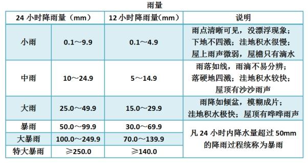 在氣象上通常用某一段時間內(nèi)降水量的多少來劃分降水強度。根據(jù)國家氣象部門規(guī)定的降水量標(biāo)準(zhǔn),降雨可分為小雨、中雨、大雨、暴雨、大暴雨和特大暴雨六種。