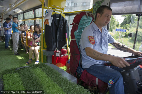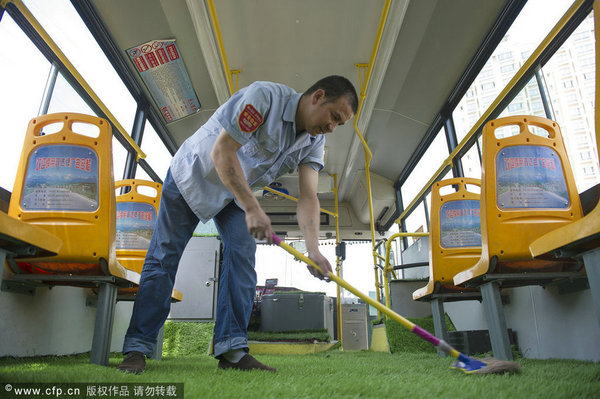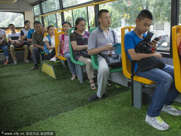 鋪了草皮的公交車開出后,乘客反映很好。“有的乘客一上來看到綠色的草坪,有的拍照,有的還彎腰觸摸一下。”外力·吐爾迪開心地對記者說。