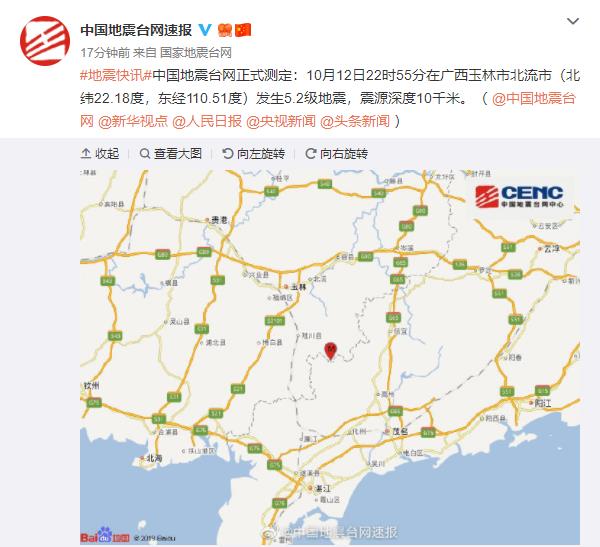 中國地震臺網(wǎng)正式測定:10月12日22時(shí)55分在廣西玉林市北流市(北緯22.18度,東經(jīng)110.51度)發(fā)生5.2級地震,震源深度10千米。