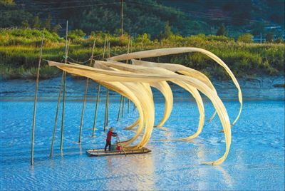 2018年11月,福建省寧德市霞浦灘涂上,漁民駕著小船將布網(wǎng)高高掛起。 |