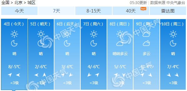 今天,北京延續(xù)晴好天氣,較適宜戶外活動。北京市氣象臺4日6時發(fā)布天氣預(yù)報,預(yù)計,今天白天晴,北轉(zhuǎn)南風(fēng)二、三級,最高氣溫8℃;夜間晴,南轉(zhuǎn)東風(fēng)二、三級,最低氣溫零下5℃。