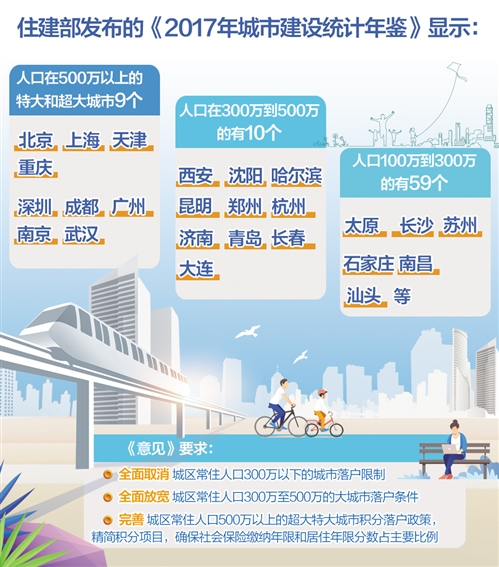 武漢大學中國發(fā)展戰(zhàn)略與規(guī)劃研究院副院長吳傳清認為,這與今年4月國家發(fā)展改革委發(fā)布的《2019年新型城鎮(zhèn)化建設(shè)重點任務(wù)》相互呼應,并更加深化?!吨攸c任務(wù)》提出,繼續(xù)加大戶籍制度改革力度,在此前城區(qū)常住人口100萬以下的中小城市和小城鎮(zhèn)已陸續(xù)取消落戶限制的基礎(chǔ)上,城區(qū)常住人口100萬至300萬的Ⅱ型大城市要全面取消落戶限制;城區(qū)常住人口300萬至500萬的Ⅰ型大城市要全面放開放寬落戶條件,并全面取消重點群體落戶限制。超大特大城市要調(diào)整完善積分落戶政策,大幅增加落戶規(guī)模、精簡積分項目,確保社保繳納年限和居住年限分數(shù)占主要比例。