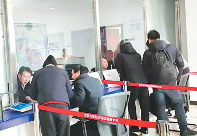 “大家先不要急。留一兩個人在窗口講,讓我先了解情況。那邊有椅子,其他各位歇歇坐坐,喝口水。”窗口內(nèi),身穿藍色制服的工作人員向前欠起身,語氣平和鎮(zhèn)定地說道,緊繃的氣氛稍微緩和了些。