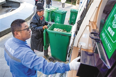 2019年11月25日,東城區(qū)新怡家園,工作人員正在將廚余垃圾收入廚余垃圾回收車內(nèi)。記者 李凱祥 攝