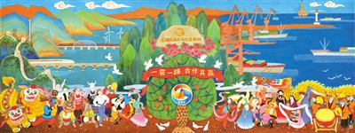 聚焦時代主題,新年畫創(chuàng)作與時代同頻共振。例如年畫《一帶一路》是為慶祝2017年5月在北京舉行的“一帶一路”國際合作高峰論壇而作。作品以喜慶、歡騰為基調(diào),融匯民間美術(shù)元素來表達對此次盛會的祝賀。畫面中央那棵“生命樹”,就是民間美術(shù)中常用來象征旺盛生命力的吉祥圖式符號。把此次會議會徽置于樹中,上方裹有紅色綢帶,寫著“一帶一路,合作共贏”,寓意蓬勃向上的旺盛生命力。其間飛翔的白鴿,象征和平發(fā)展的環(huán)境。畫面左邊有客貨列車及風電綠色能源,與近處山巒中的長城相映襯,寓意古老中華文明正煥發(fā)新的生命力;右邊有繁華的海港碼頭、藍色海洋上來往船只……作品藝術(shù)地表達了“一帶一路”的恢弘主題,拓寬了年畫創(chuàng)作的題材,也是年畫“筆墨當隨時代”的真實寫照。