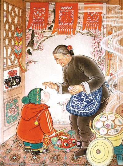 凝練生動的時代故事,讓新年畫引發(fā)廣泛的情感共鳴。“搖啊搖,搖到外婆橋……”這首江南耳熟能詳?shù)耐{勾起多少海外游子的思鄉(xiāng)情。廖開明的《搖到外婆橋》以這首童謠點題,生動描繪了海外游子歸來尋根的情景,表現(xiàn)了對國家、民族、文化認同的家國情懷,反映出文旅融合的新氣象。張苠的《奶奶點福點》以獨特的視角,表現(xiàn)了春節(jié)農(nóng)家的喜慶氣氛。北方農(nóng)家春節(jié)蒸面花時,要用食色(紅)在熱氣騰騰的面花上點上紅點,亦稱福點,以示吉利。畫面上小孫子手持魚燈跑來,奶奶為愛孫額頭點上個福點,祝他吉祥平安,幸福生長。背景門楣的吊箋,門上的肥豬拱門剪紙,門外喜鵲登梅,飄著瑞雪,營造出一派喜慶、祥和、溫馨的春節(jié)情景。