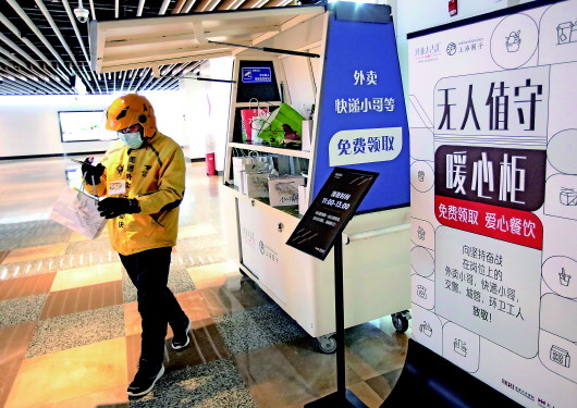 近日,“無人值守暖心柜”公益項(xiàng)目亮相上海多家商場和購物中心。“暖心柜”中擺放著商戶、租戶和市民們獻(xiàn)愛心送來的餐點(diǎn)、熱飲和小商品等,供外賣員、快遞員、環(huán)衛(wèi)工人等免費(fèi)領(lǐng)取,以感謝這些職業(yè)工作者在疫情期間堅(jiān)守崗位、為民服務(wù)。 新華社記者劉穎攝