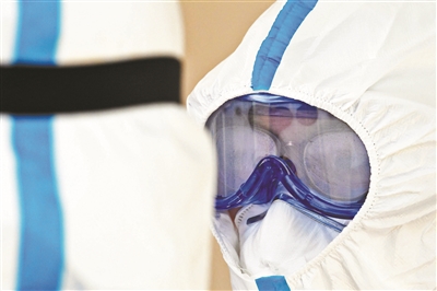 在隔離病房待了一會兒,流調(diào)員的護(hù)目鏡就起了霧氣。記者 付丁 攝