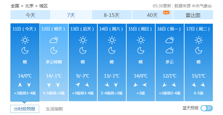 根據(jù)北京市氣象臺今早6時發(fā)布的最新預(yù)報,今天白天晴,北轉(zhuǎn)南風(fēng)2、3級,最高氣溫14℃;夜間晴間多云,南風(fēng)1、2級轉(zhuǎn)北風(fēng)3、4級(陣風(fēng)6級),最低氣溫1℃。