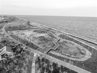 圖為生態(tài)城東堤公園的人工濕地景觀,沿海一側(cè)種植了耐鹽堿的檉柳。受訪者供圖