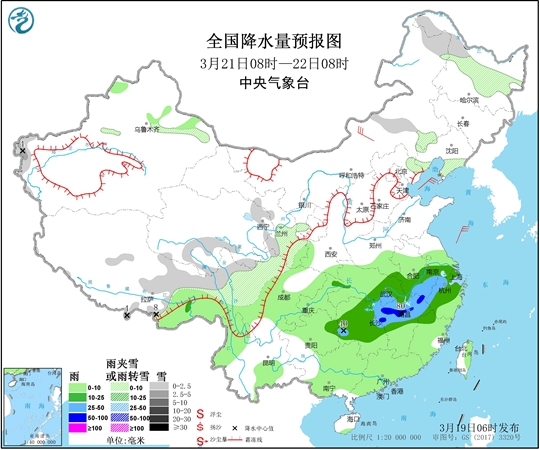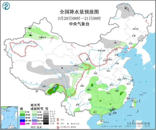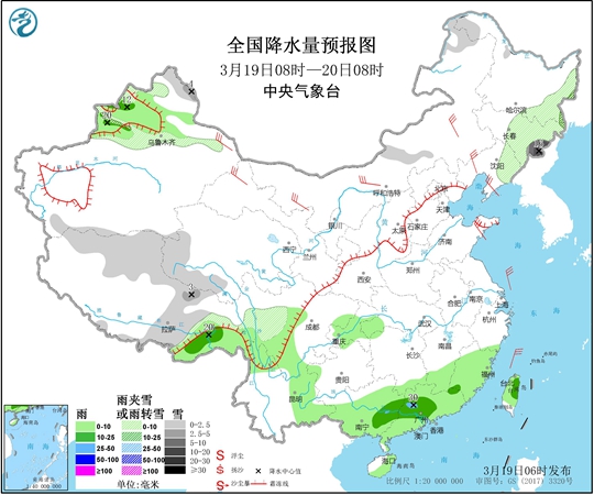 至于南方,今天降雨范圍縮減,雨勢短暫減弱。中央氣象臺預計,東北地區(qū)中東部、新疆北部高海拔地區(qū)、西藏北部和東部、青海西南部、川西高原南部等地的部分地區(qū)有小到中雪或雨夾雪,吉林東部山區(qū)局地大雪或暴雪(10~16毫米);廣西東部、廣東西部和南部、西藏東南部、新疆伊犁河谷等地的部分地區(qū)有中雨,局地大雨(25~30毫米)。