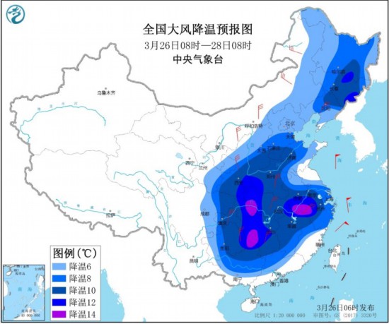 26日08時至28日08時,西北地區(qū)東部、華北、東北地區(qū)大部、黃淮、江淮、江漢、江南大部等地先后有4~6級風(fēng),陣風(fēng)7~9級,上述大部地區(qū)日平均氣溫或最低氣溫下降6~10℃,黑龍江南部、吉林北部和東南部、陜西東南部、河南西南部、湖北西部、湖南西部、安徽南部等地的部分地區(qū)降溫可達(dá)12℃以上。