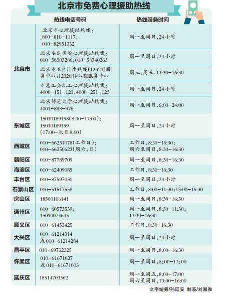 目前,全市已經(jīng)陸續(xù)開通了十余條心理援助熱線,所有接聽人員均為專業(yè)人士,為市民免費(fèi)提供心理支持、情緒疏導(dǎo)、危機(jī)干預(yù),幫助大家穩(wěn)定情緒,維護(hù)心理健康。與此同時(shí),不少高校、街道和鄉(xiāng)鎮(zhèn)也紛紛通過電話咨詢、線上講座、微信群聊等方式,為市民提供心理咨詢服務(wù)。
